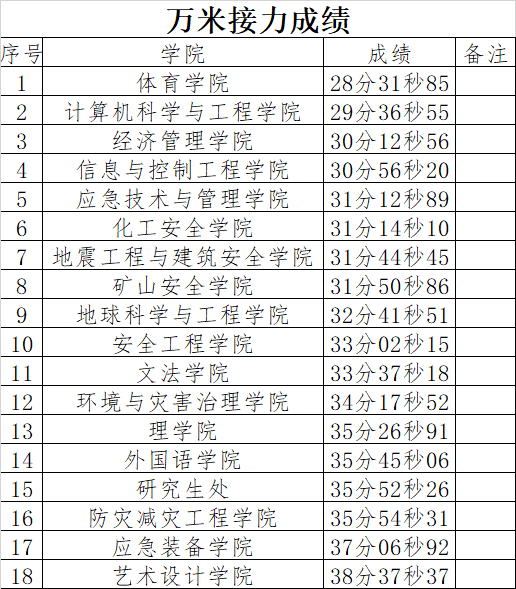 经过激烈角逐,体育学院获得万米接力比赛冠军、计算机科学与工程学院获得比赛亚军、经济管理学院获得比赛季军。经济管理学院250723班获得跳绳比赛冠军、计算机科学与工程学院250641班、250621班分别获得亚军和季军。
